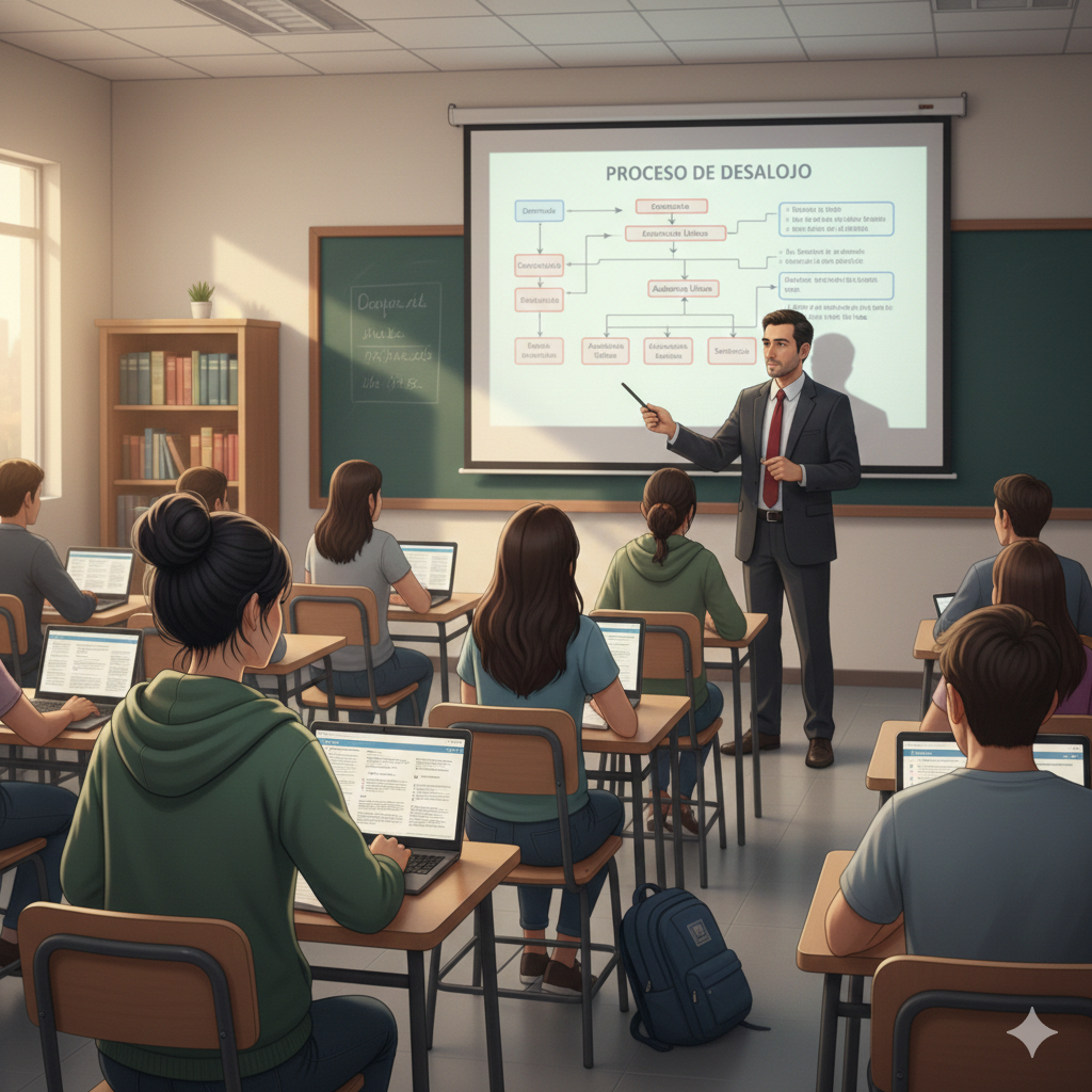 El profesor apoyó el plumón en la mesa. “En un desalojo, el conflicto real no es solo ‘quién tiene razón’. El conflicto es que muchas veces se pretende resolver con fuerza lo que debe resolverse con Derecho”.