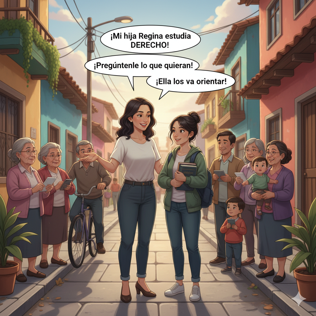 “Sí pues, hijita. En la fiesta de la señora Maruja lo dijo. Y en el puesto del pollo también. Y en la reunión de la cuadra…”, enumeró la vecina, como si levantara un acta del chisme. “Pregúntenle a mi hija, dice. Ella ya está en Derecho, ella sabe.”